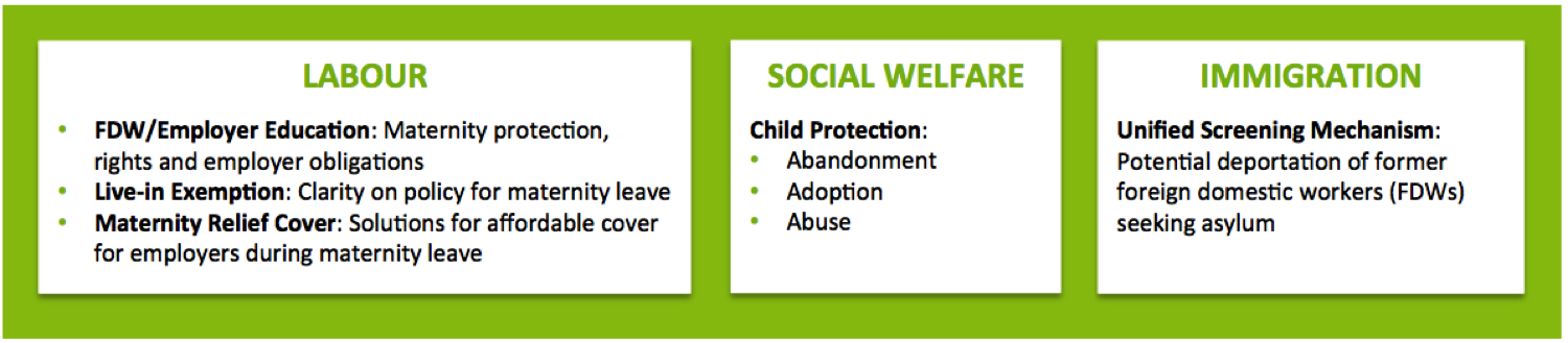 Tantangan seperti syarat legal untuk PRTA untuk dapat tinggal selama kehamilan dan sebuah solusi terjangkau untuk majikan untuk mencukupi kebutuhan selama 10 minggu cuti kehamilan dapat mengakibatkan PRTA dipecat tidak sah, ditekan untuk mengundurkan diri karena sang pekerja dan majikan tidak tahu harus berbuat apa.