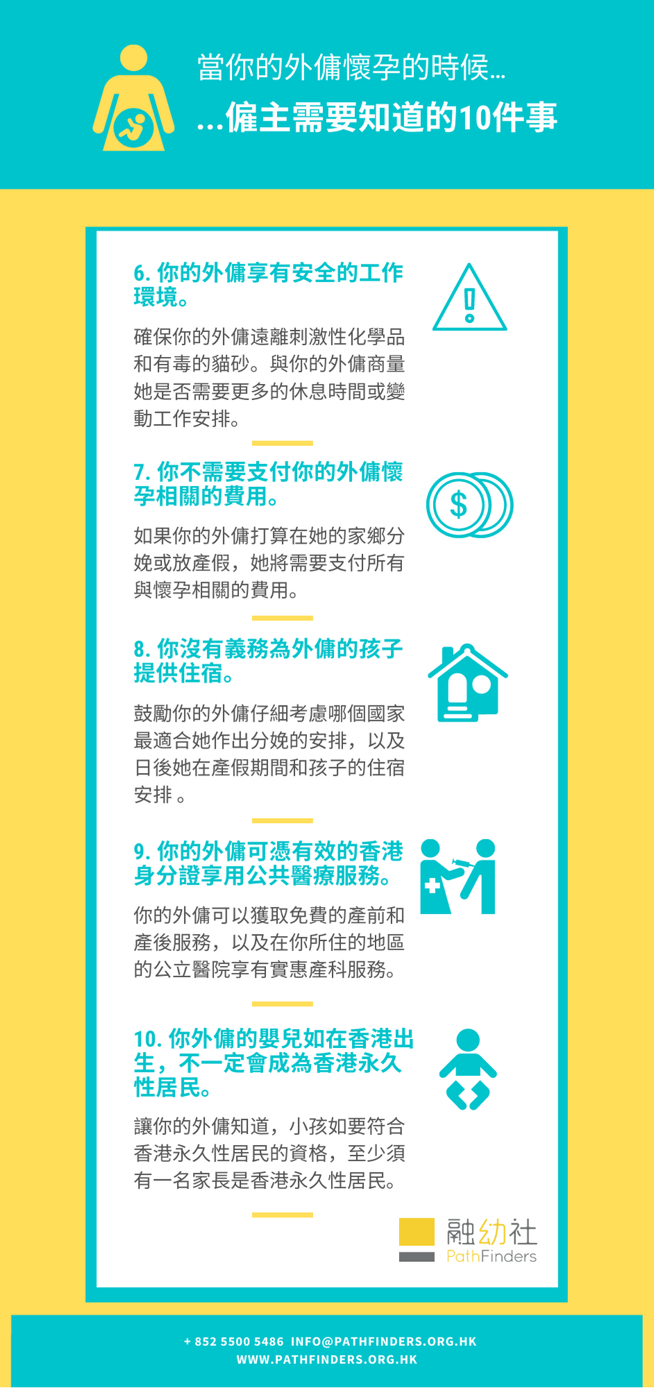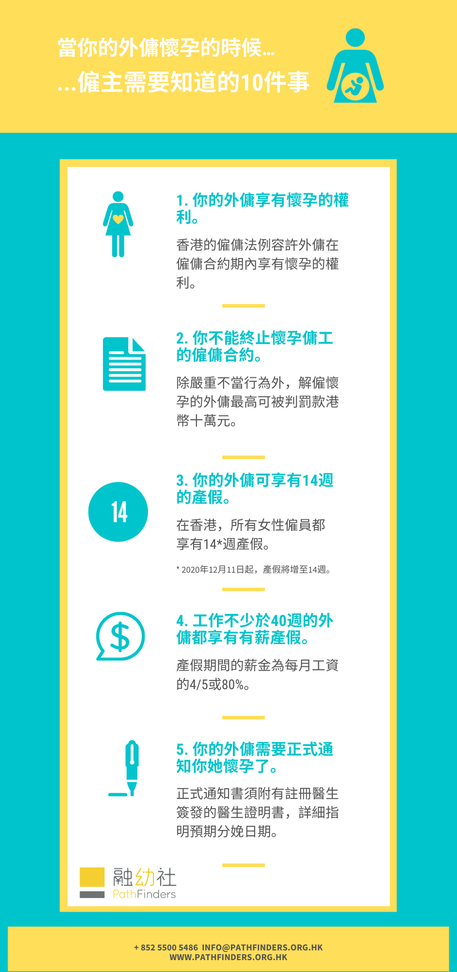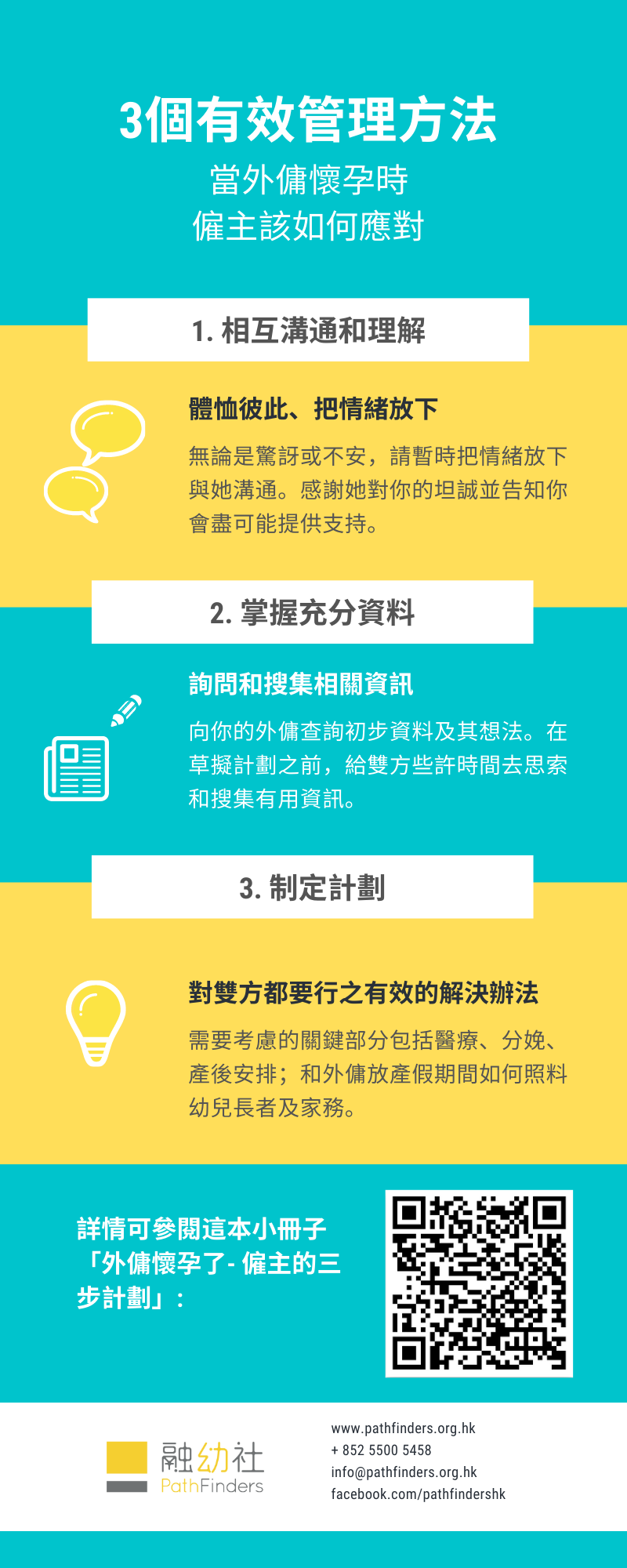 當發現或獲悉外籍家庭傭工懷孕時,許多僱主都沒足夠的準備和得到正確的資訊,以便支援懷孕的外傭,並且為家庭的工作安排做出最好的預備。